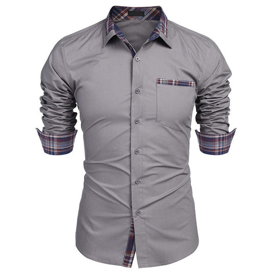 Men's Slim Fit Plaid Detail Dress Shirt, Casual Business Long Sleeve Button-Up